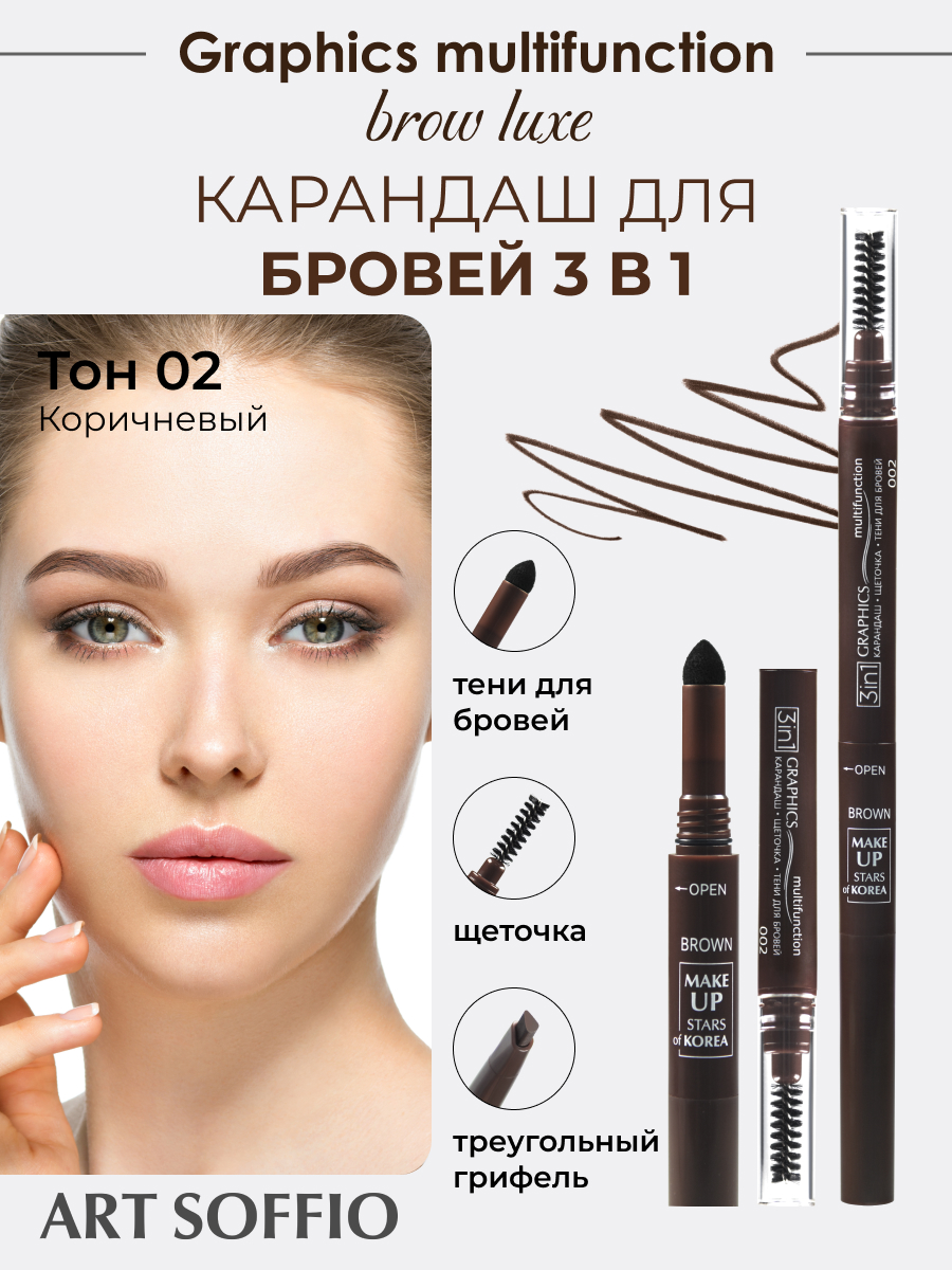 Cоздавайте красивые брови с помощью одного универсального мультифункционального карандаша 3 в 1 ART SOFFIO Brow luxe. В данный продукт входят карандаш для бровей, порошковые тени и щеточка для расчесывания бровей. Карандаш мягко и естественно подчеркивает и