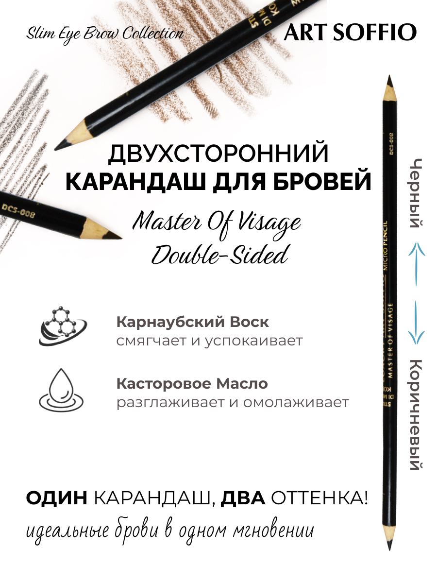 Двухсторонний карандаш Soffio Masters обладает уникальным свойством создавать выразительный взгляд, даже при полном отсутствии макияжа на лице. При сочетании разных тонов коричневого с дымчато-черным. можно получить различные комбинации. Используйте с различными техниками макияжа бровей и для эскизных наметок при карандашной технике make-up.