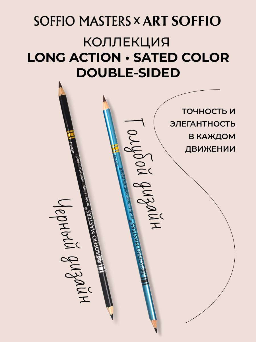 Двусторонний карандаш Soffio Masters составлен таким образом, чтобы удобно было сочетать разные тона коричневого с дымчато-черным, так как именно эти два тона в комбинации и в разных оттенках, используются при различных техниках макияжа бровей и для эскизных наметок при карандашной технике make-up.