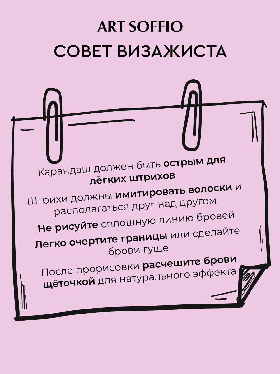 1.КАРАНДАШ ДОЛЖЕН БЫТЬ ДОСТАТОЧНО ОСТРЫМ ДЛЯ НАНЕСЕНИЯ ЛЁГКИХ ШТРИХОВ ЛИНИЙ В ТЕХ МЕСТАХ, КОТОРЫЕ НУЖНО ПОДРИСОВАТЬ. ШТРИХИ, ИМИТИРУЮЩИЕ ВОЛОСКИ БРОВИ, ДОЛЖНЫ РАСПОЛАГАТЬСЯ ДРУГ НАД ДРУГОМ.