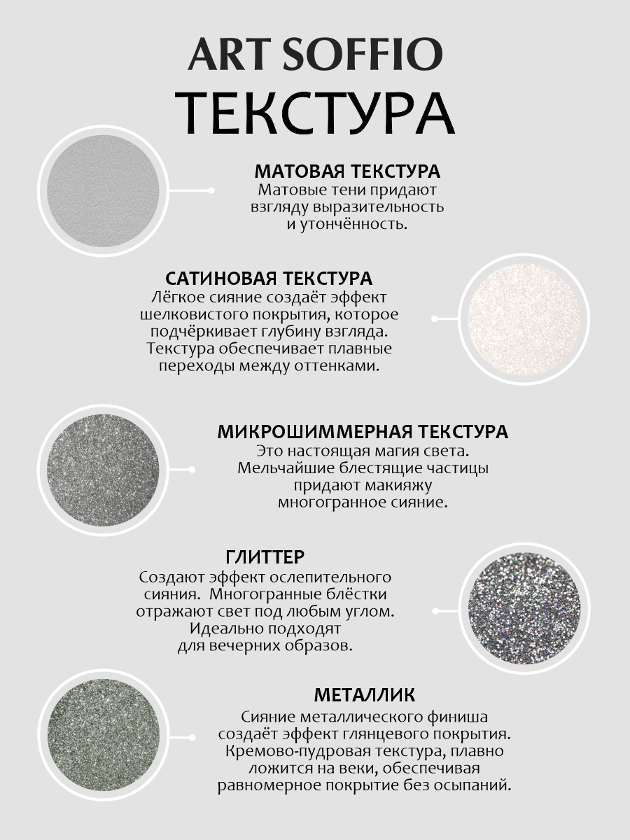Роскошная Платина — дарит возможность играть с текстурами, создавая утонченный дневной образ или роскошный вечерний макияж. Каждый оттенок – это шаг к идеальному отражению, в котором гармония формы и света подчеркивает неповторимость.