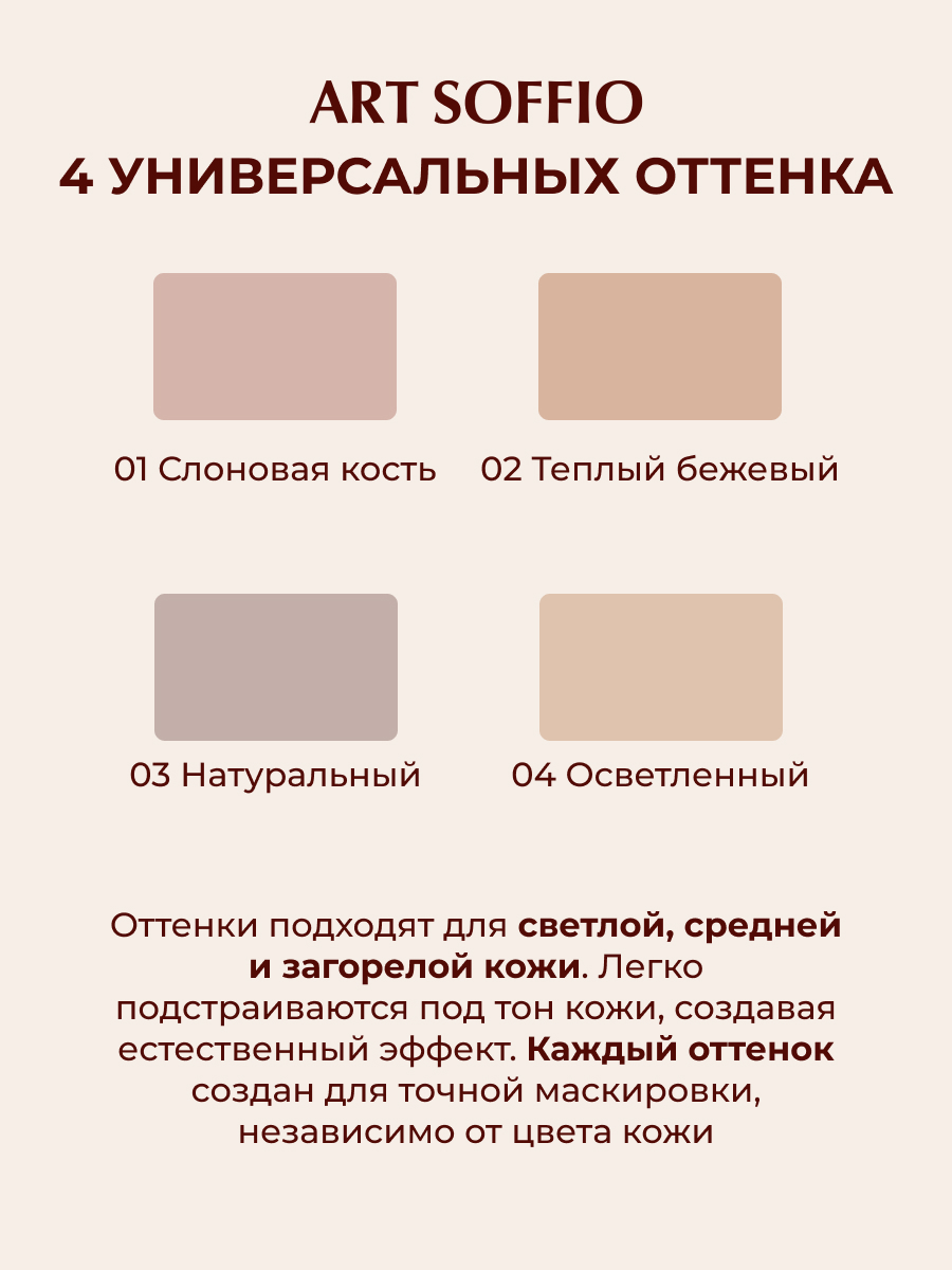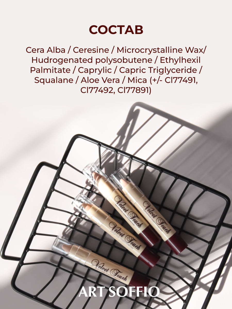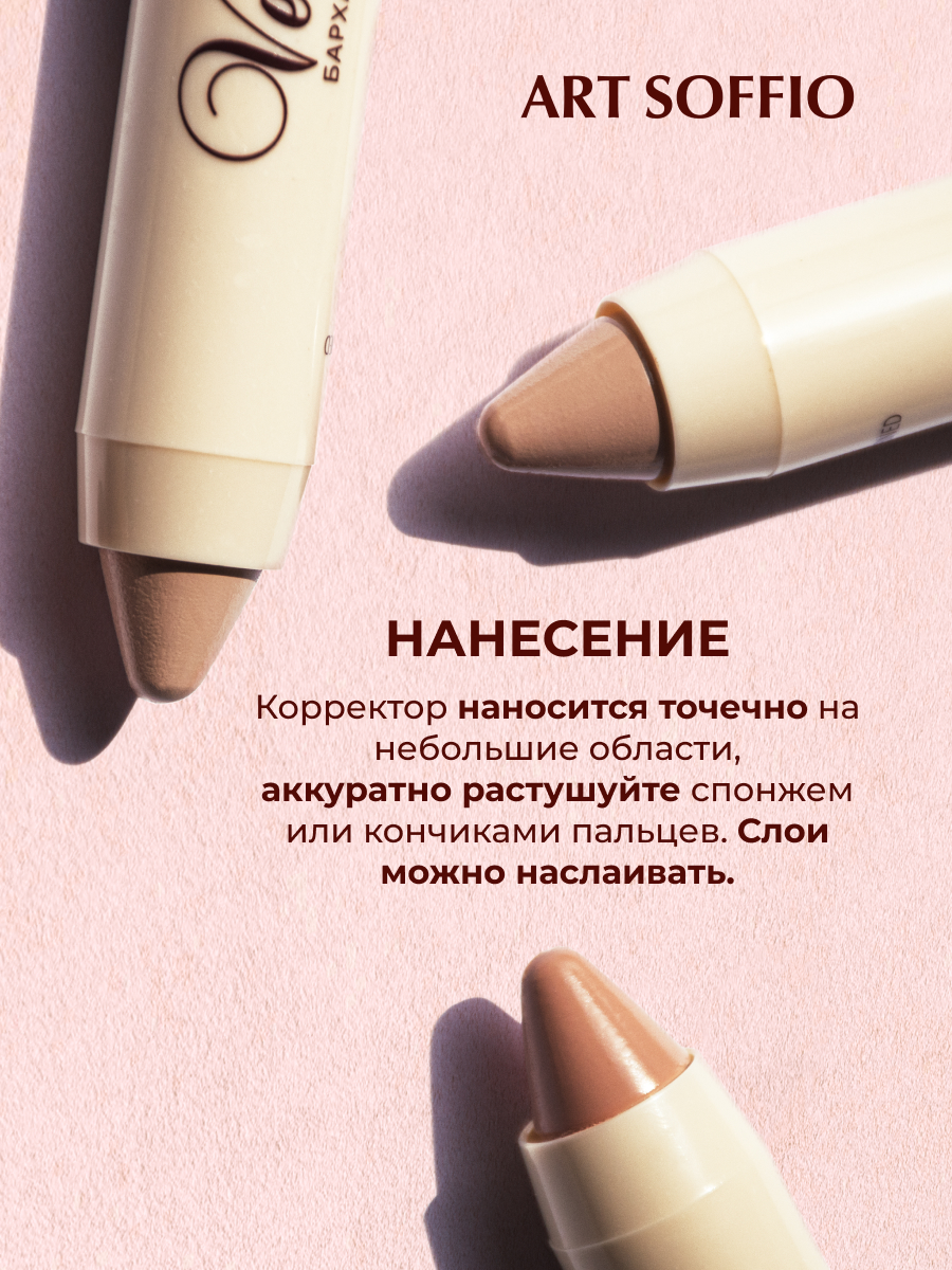 Имеет плотную кремообразную структуру и прекрасно скрывает несовершенства кожи. Корректор “VELVET TOUCH” имеет большую область применения и решает проблему с цветом кожи в следующих случаях: