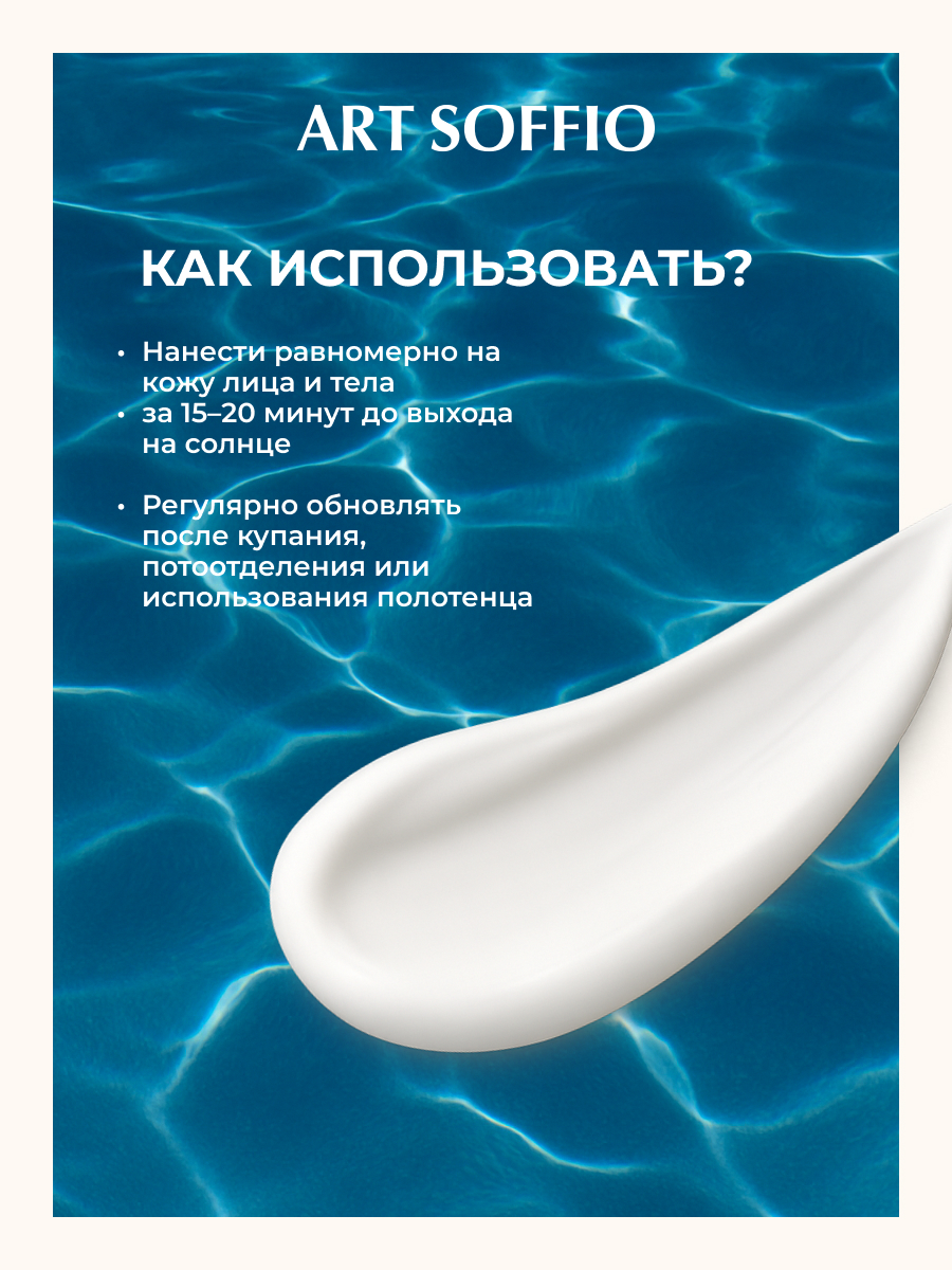 Способ применения: Нанесите крем непосредственно перед выходом на солнце. Возобновляйте нанесение средства, чтобы обеспечить защиту, особенно если вы вспотели, купались, вытирались полотенцем.
