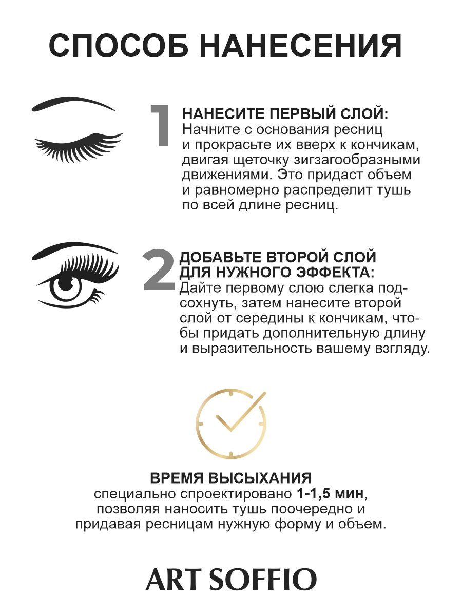 Сохнет на ресницах 1-1,5 мин. Это время, которое специально отрегулировано разработчиками ART SOFFIO и позволяет наносить тушь поочередно: сначала на один глаз, затем пока сохнут ресницы, можно работать с другим. Такой интервал времени к нанесению текстуры позволяет успеть придать нужную форму ресницам и нанести столько слоев туши сколько потребуется.