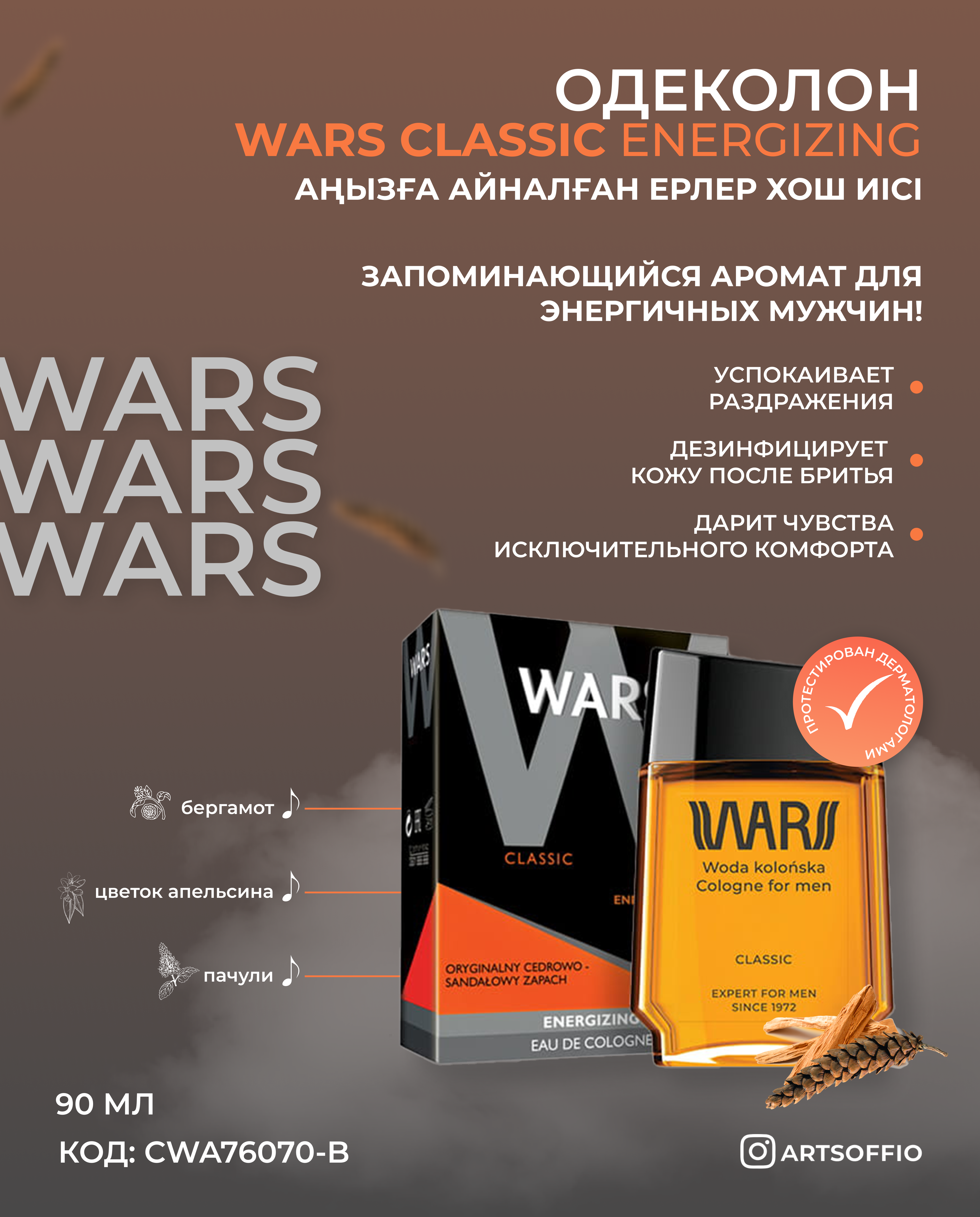Классический одеколон культового бренда Wars Classic c бодрящим кедрово-сандаловым ароматом прекрасно дезинфицирует кожу после бритья, освежает и успокаивает. Одеколон имеет легкий, освежающий и универсальный аромат. Он приносит приятное облегчение в жаркие летние дни и окутывает осенними вечерами.